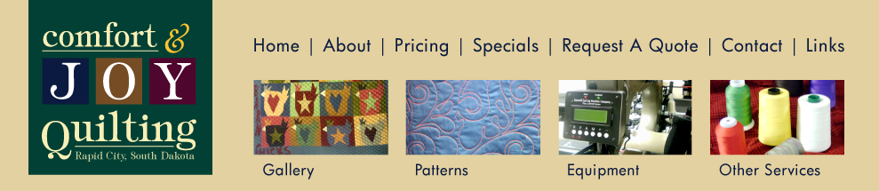 Comfort & Joy Quilting specializes in quality longarm machine quilting. Let Comfort & Joy Quilting finish your edge to edge quilts. We take pride in the level of service and care we provide to our customers’ quilts. We do everything possible to turn your lovely quilt top into a finished result you can be proud of! We have a completely smoke free environment at Comfort & Joy Quilting.